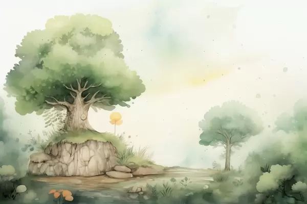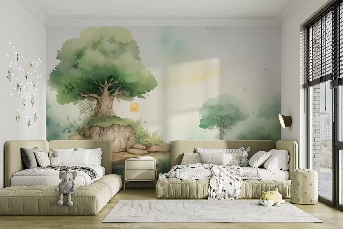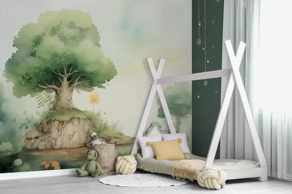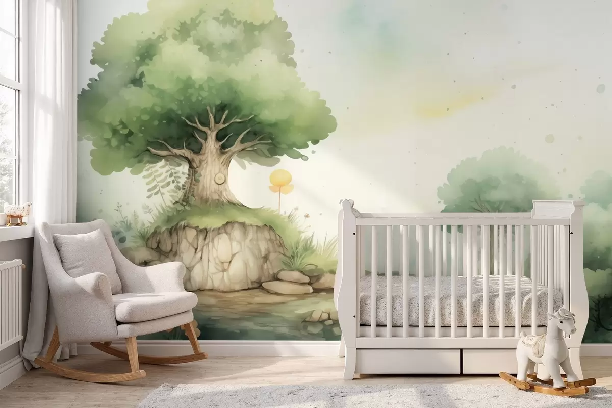 Murais de parede Um mundo de conto de fadas da infância numa paisagem florestal verdejante, em estilo aquarela Nr. w09566