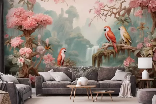 Murais de parede Uma floresta tropical de conto de fadas com papagaios, árvores floridas com flores cor-de-rosa e uma cascata Nr. w09580
