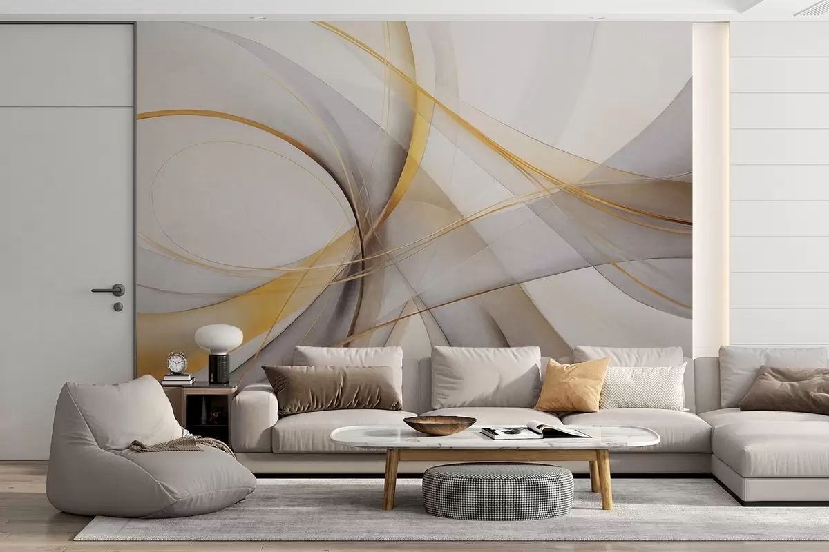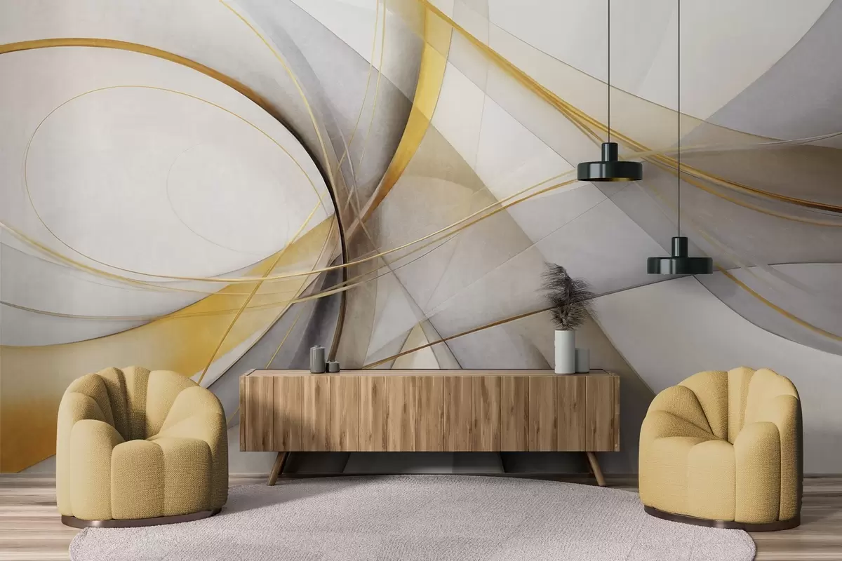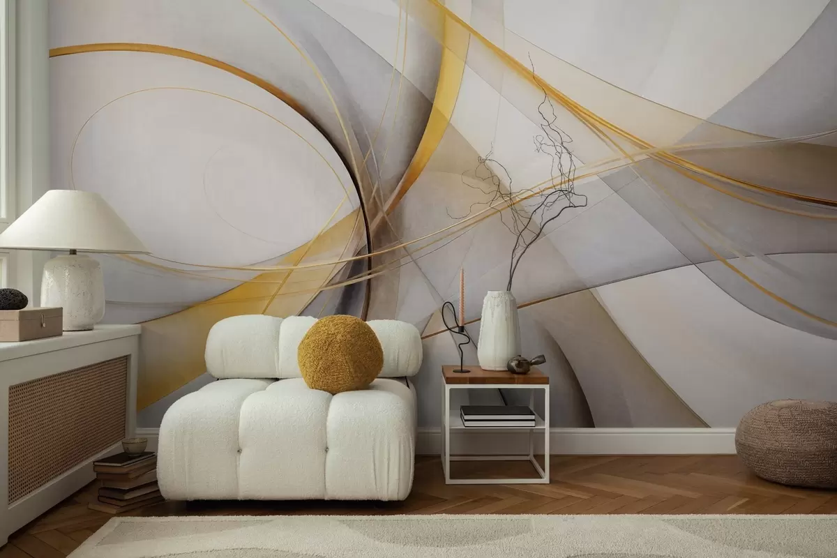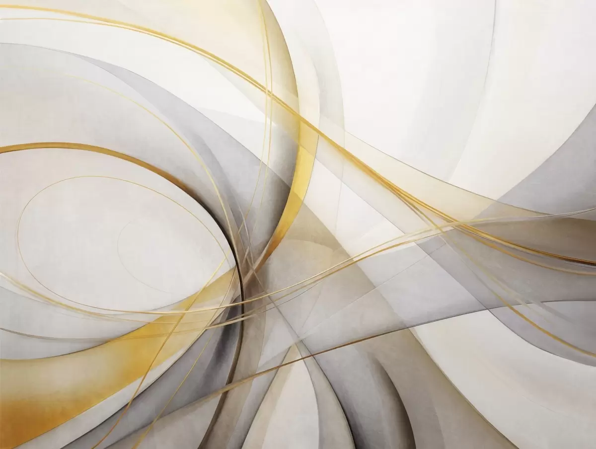 Murais de parede Linhas abstratas fluidas em amarelo e branco sobre fundo cinzento, com sensação de movimento e profundidade, arte moderna Nr. w09587