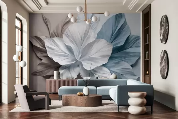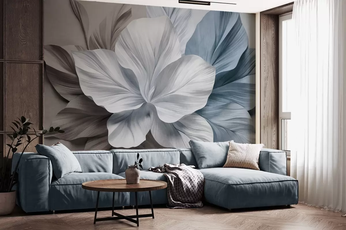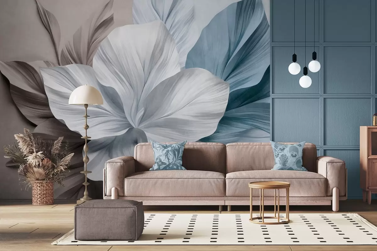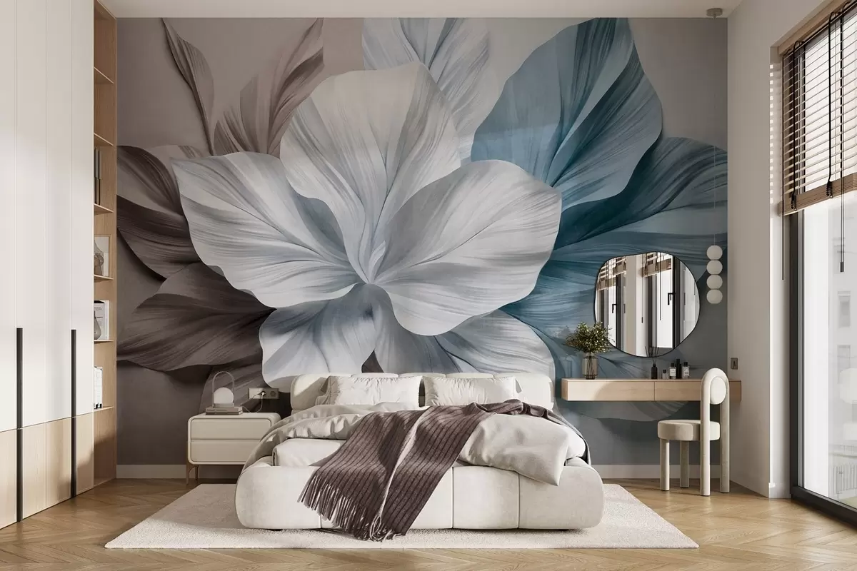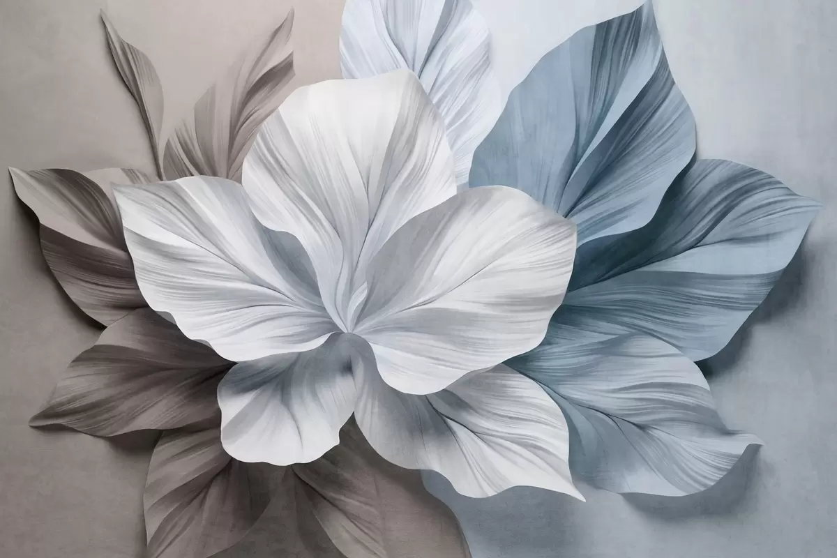 Murais de parede Flor abstrata com várias pétalas e folhas texturizadas em tons de castanho e azul, fundo suave Nr. w09604v1