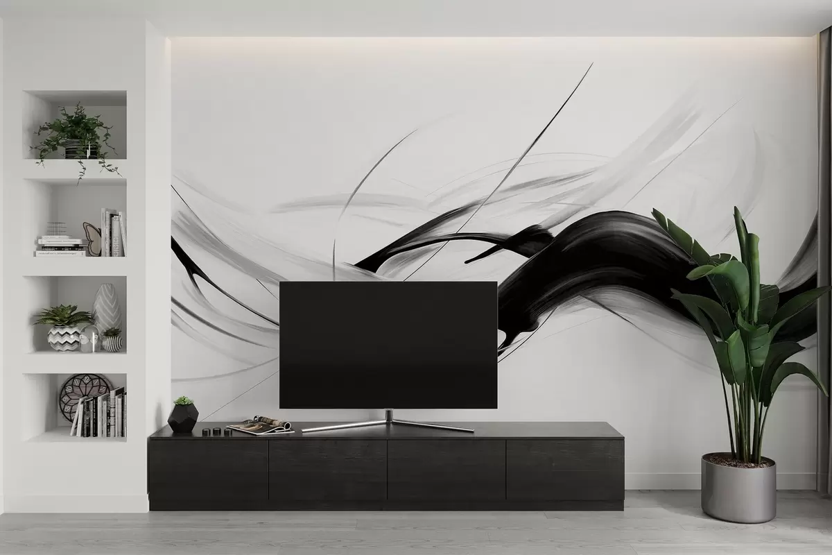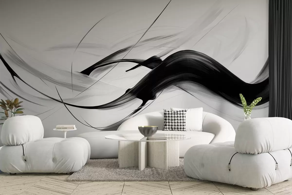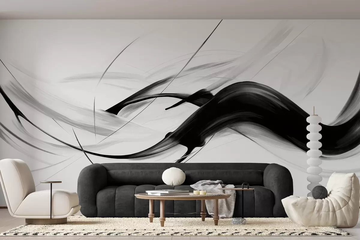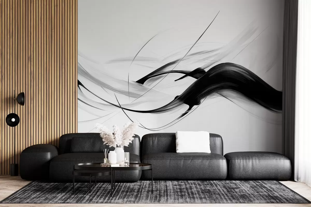 Murais de parede Pinceladas abstratas a preto e branco com linhas finas criando um design moderno contra um fundo claro Nr. w09605