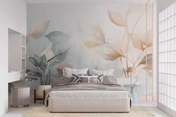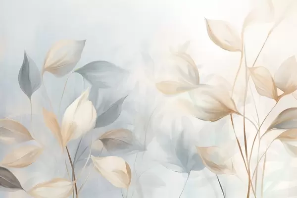 Murais de parede Folhas suaves, delicadas e translúcidas em tons suaves de bege, pêssego e azul claro, arte pastel texturizada Nr. w09607