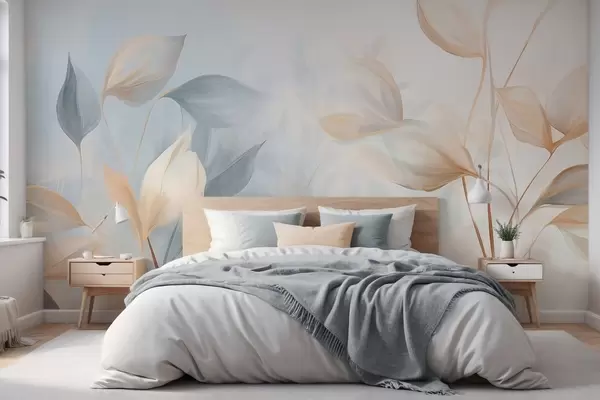 Murais de parede Folhas suaves, delicadas e translúcidas em tons suaves de bege, pêssego e azul claro, arte pastel texturizada Nr. w09607