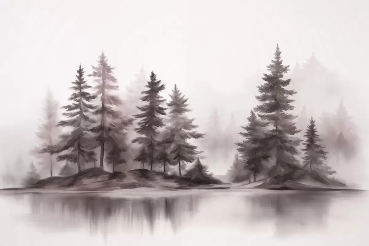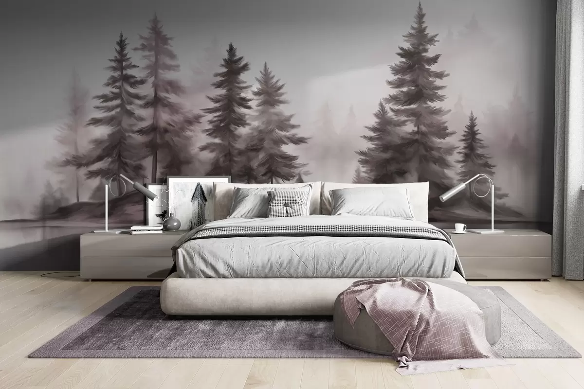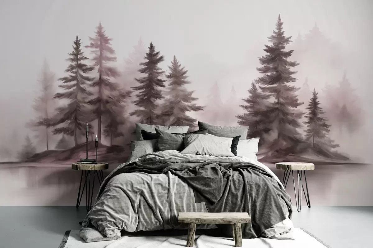 Murais de parede Uma floresta enevoada e texturizada com pinheiros altos pintados de forma imitativa Nr. w09610v1