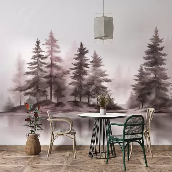 Murais de parede Uma floresta enevoada e texturizada com pinheiros altos pintados de forma imitativa Nr. w09610v1
