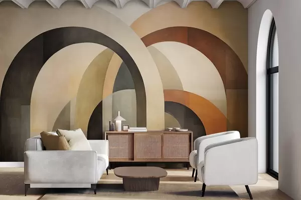 Murais de parede Arcos geométricos abstratos texturizados em tons terrosos de bege, castanho e cinza, um design arquitetónico moderno em camadas Nr. w09611