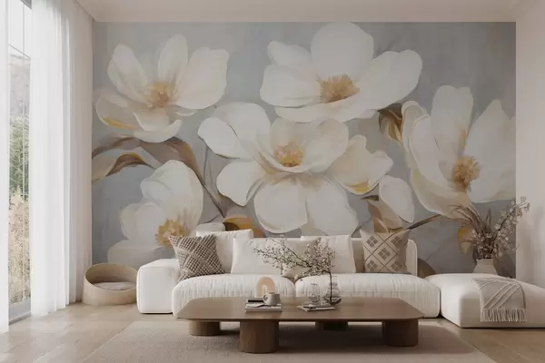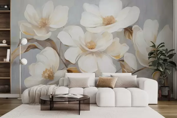 Murais de parede Uma pintura texturizada que imita várias flores brancas de magnólia contra um fundo pastel suave Nr. w09612