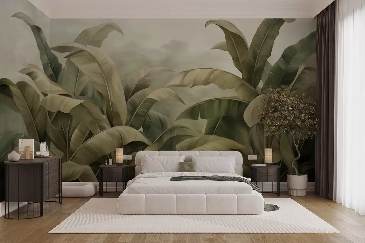 Murais de parede Paisagem de selva densa e texturizada com grandes folhas de bananeira em tons suaves de verde e bege Nr. w09613