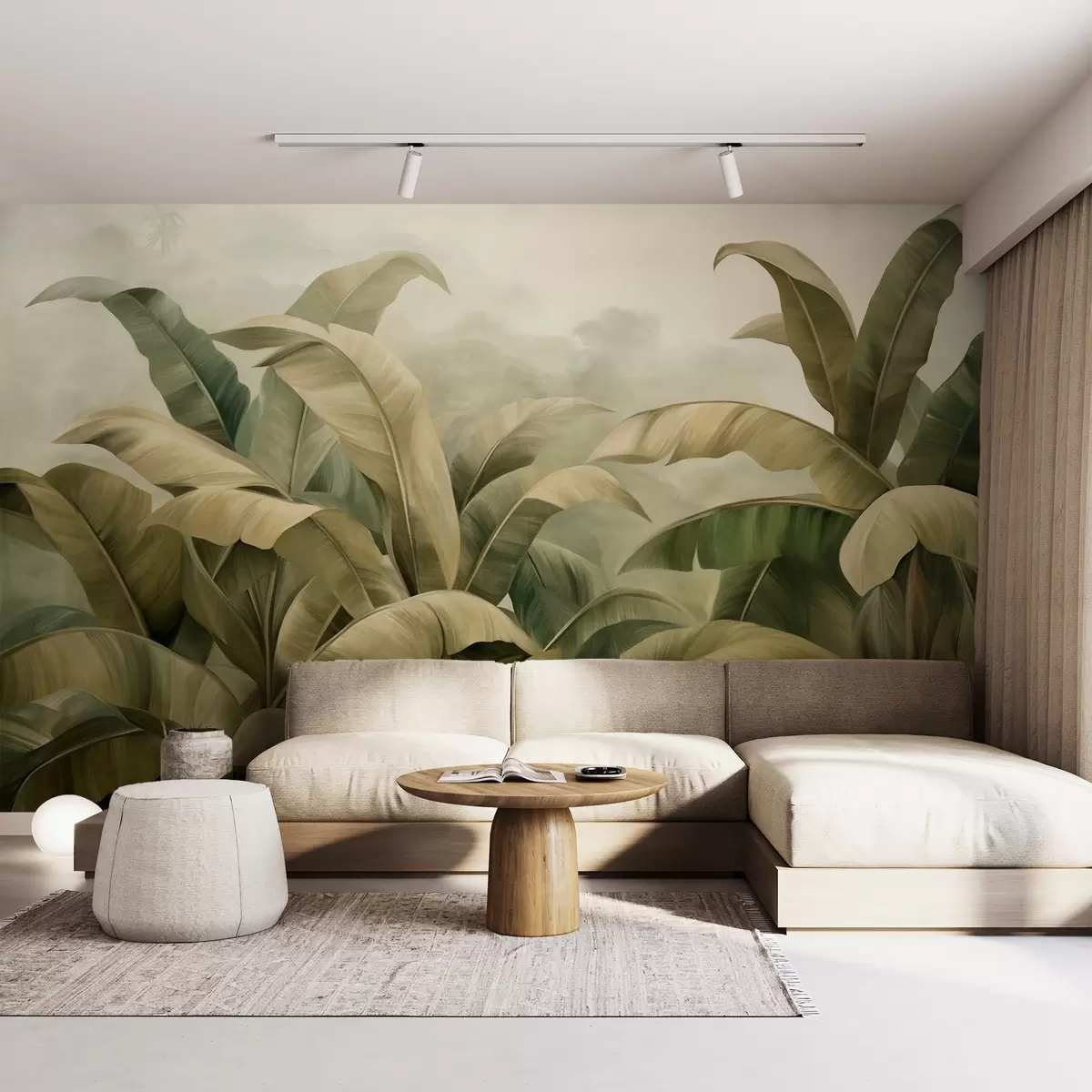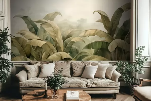 Murais de parede Paisagem de selva densa e texturizada com grandes folhas de bananeira em tons suaves de verde e bege Nr. w09613