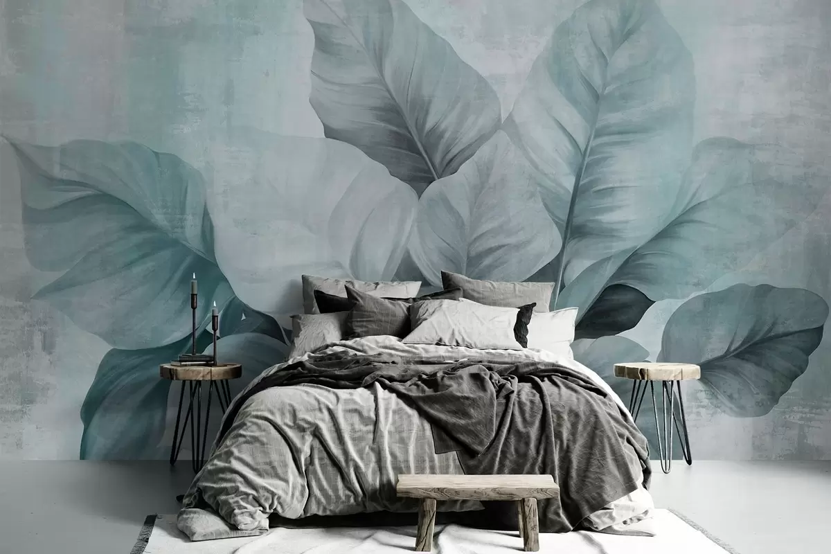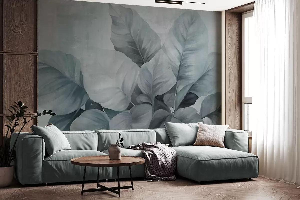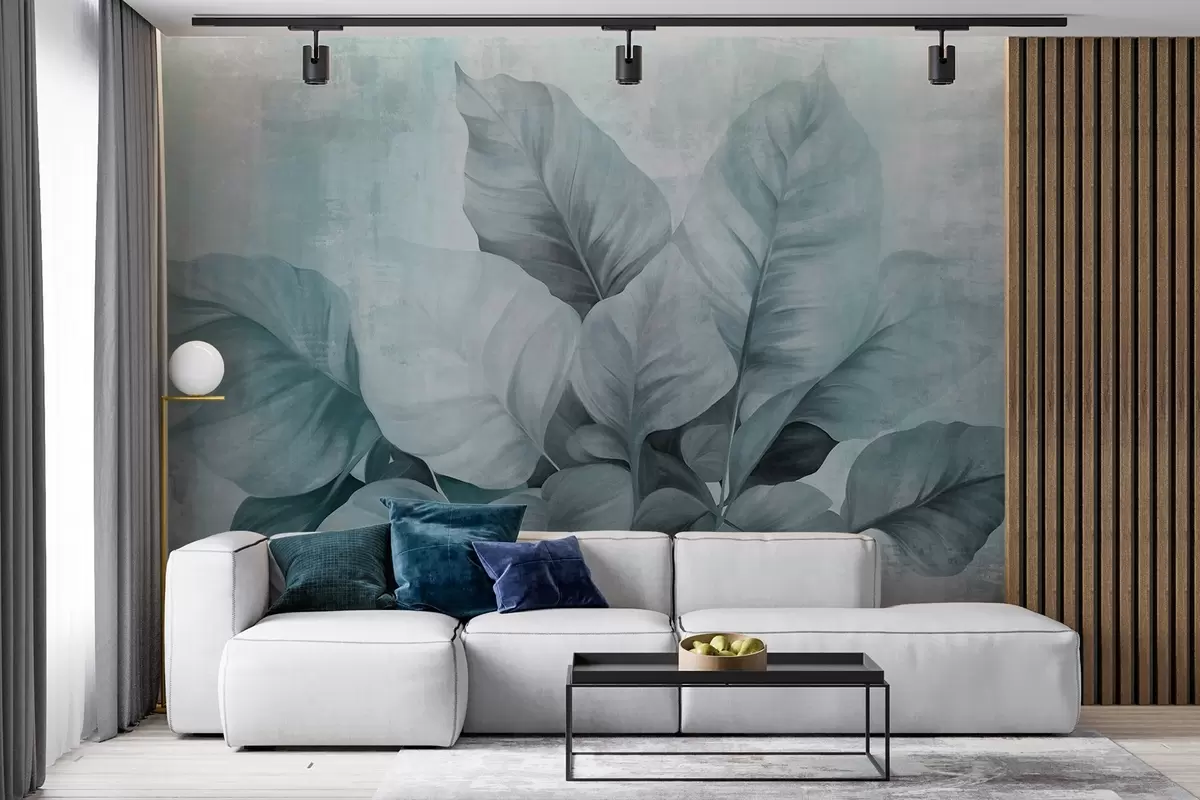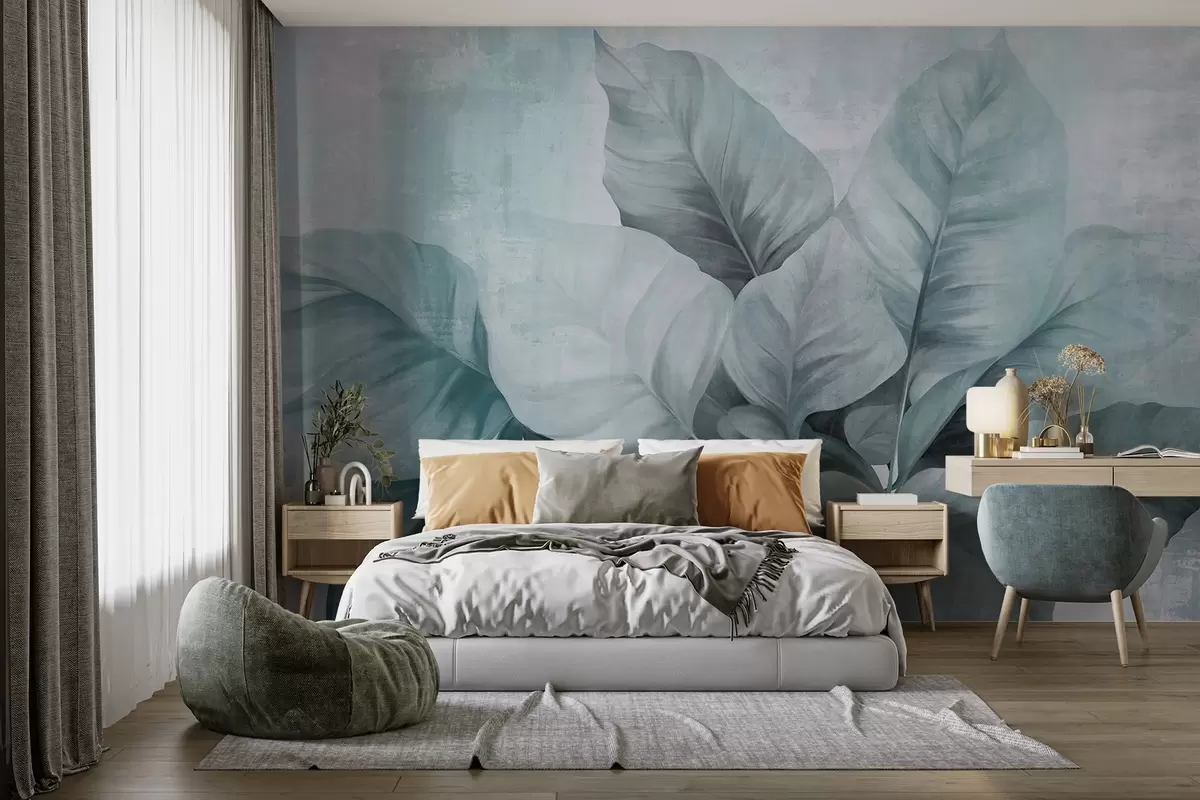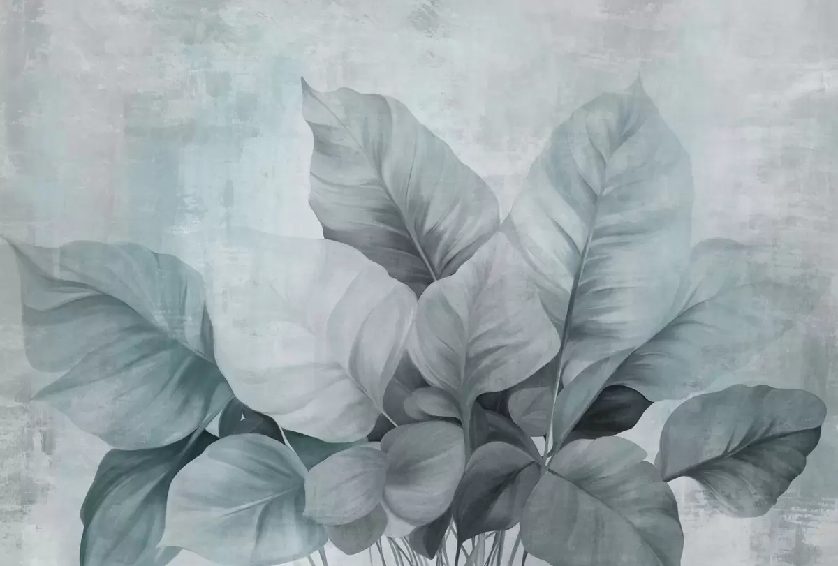 Murais de parede Pintura texturizada imitando grandes folhas azuis claras contra um fundo neutro com pinceladas subtis Nr. w09614v2