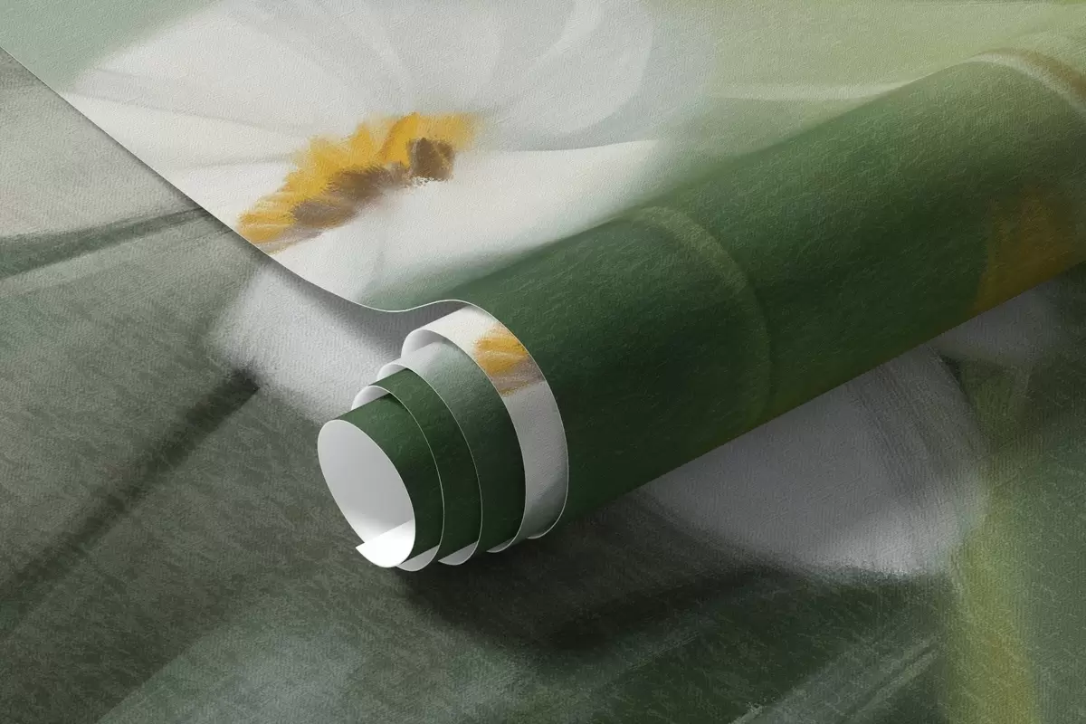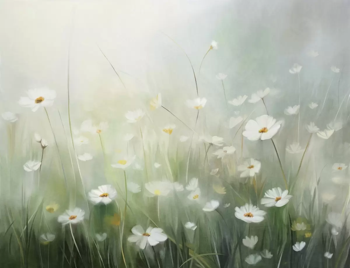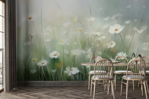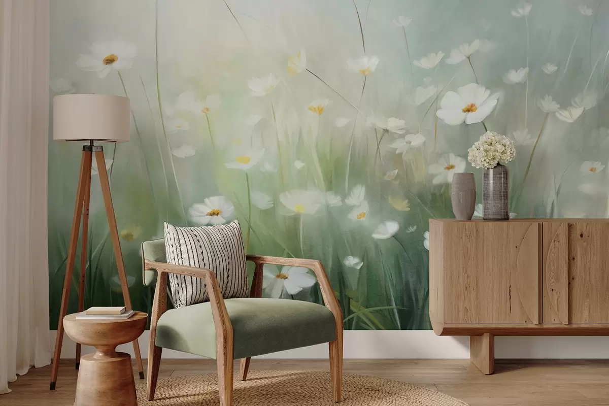 Murais de parede Campo abstrato de margaridas brancas com relva verde e um fundo suave e nebuloso em estilo pictórico Nr. w09619
