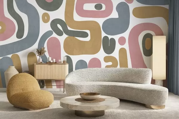 Murais de parede Formas abstratas texturizadas em rosa pastel, azul suave, amarelo mostarda e cinza sobre fundo branco arte moderna Nr. w09620