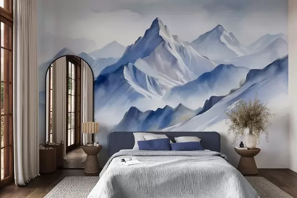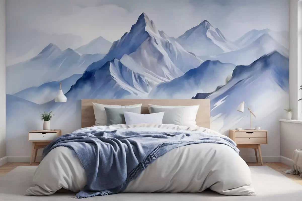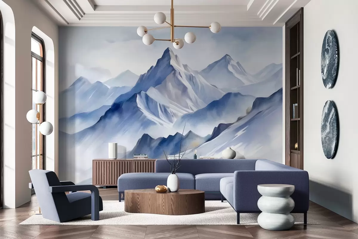 Murais de parede Montanhas nevadas texturizadas com um efeito suave de aquarela e uma paleta de azuis e brancos Nr. w09630