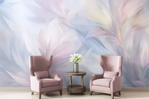 Murais de parede Folhas suaves em tons pastel e penas em tons de rosa, azul e amarelo, estampado abstrato e texturado Nr. w09634