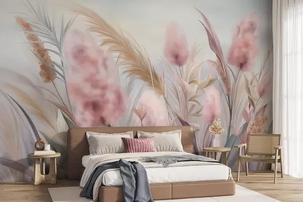 Murais de parede Grama-dos-pampas rosa e bege e outras flores secas com um céu suave e nebuloso ao fundo Nr. w09635