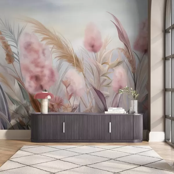 Murais de parede Grama-dos-pampas rosa e bege e outras flores secas com um céu suave e nebuloso ao fundo Nr. w09635