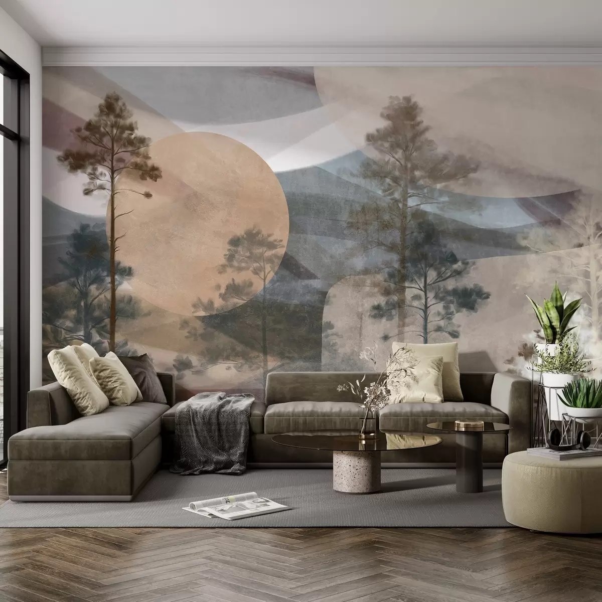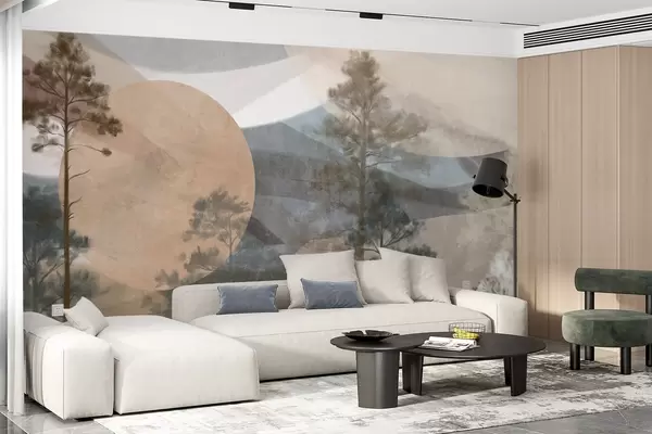 Murais de parede Pinheiros altos numa paisagem com textura suave, formas circulares abstratas e montanhas em camadas em tons terrosos Nr. w09636