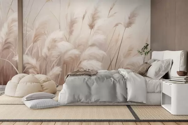 Murais de parede Erva-dos-pampas alta e texturizada em tons suaves, quentes e neutros, com um fundo claro e desfocado Nr. w09637