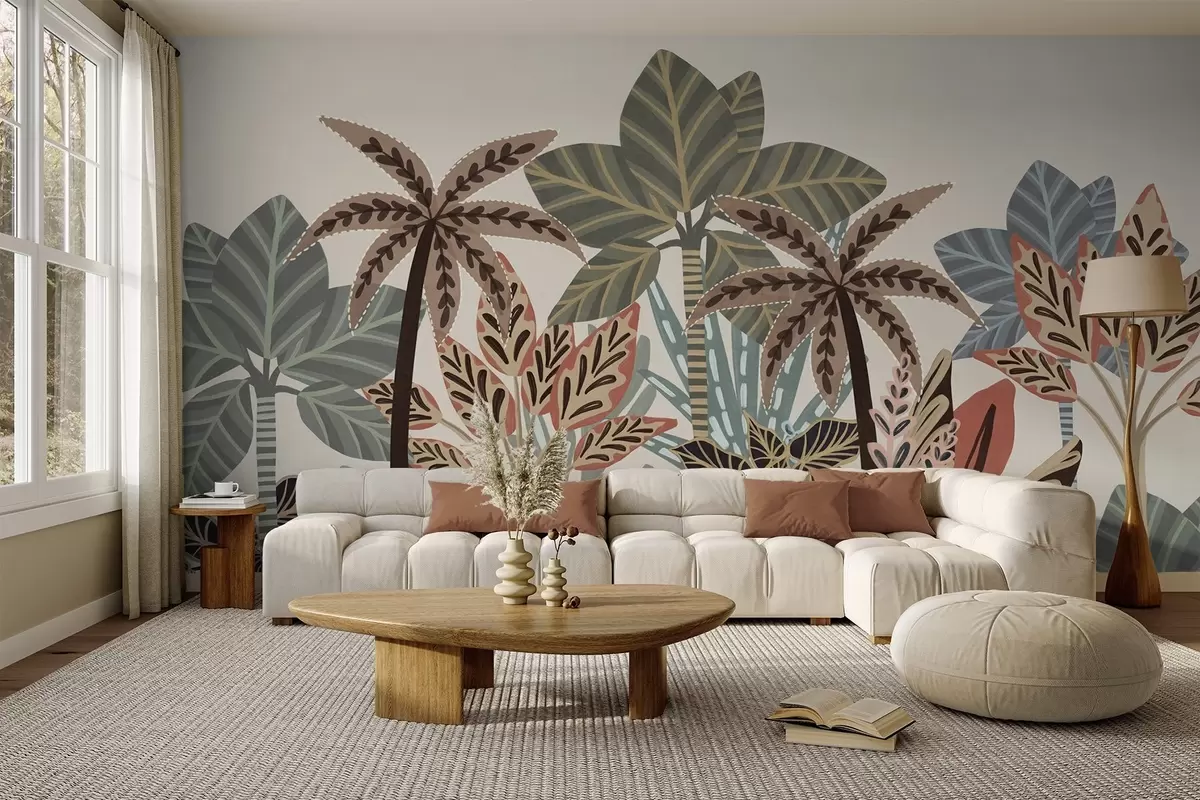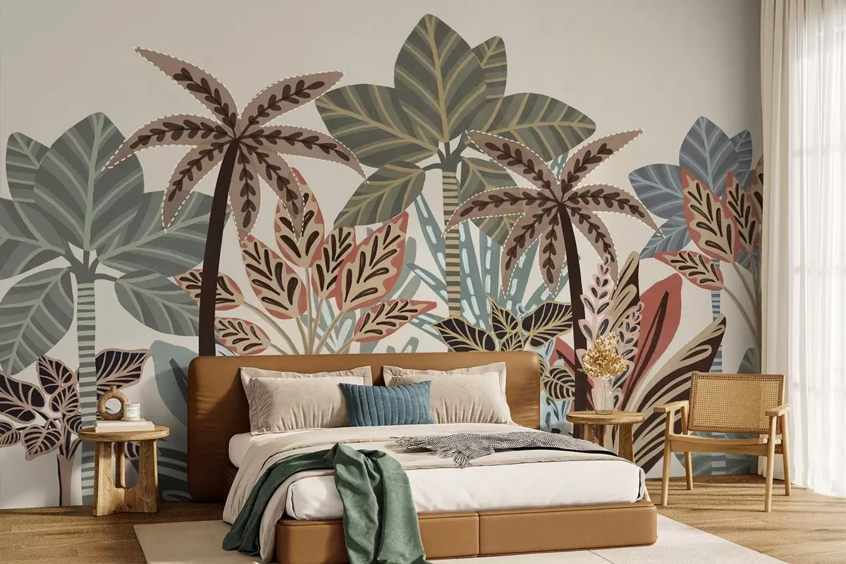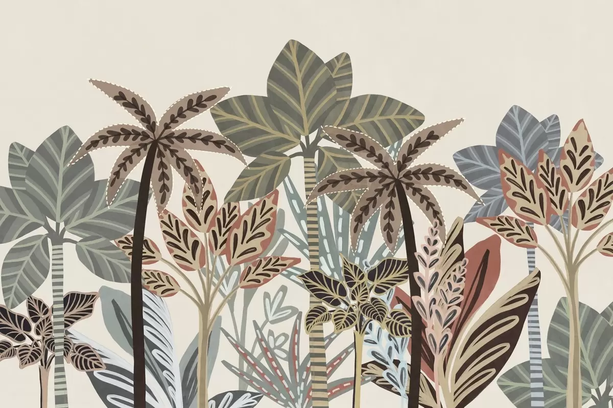 Murais de parede Plantas tropicais texturizadas e palmeiras com cores suaves em estilo boho decorativo contra um fundo creme Nr. w09639