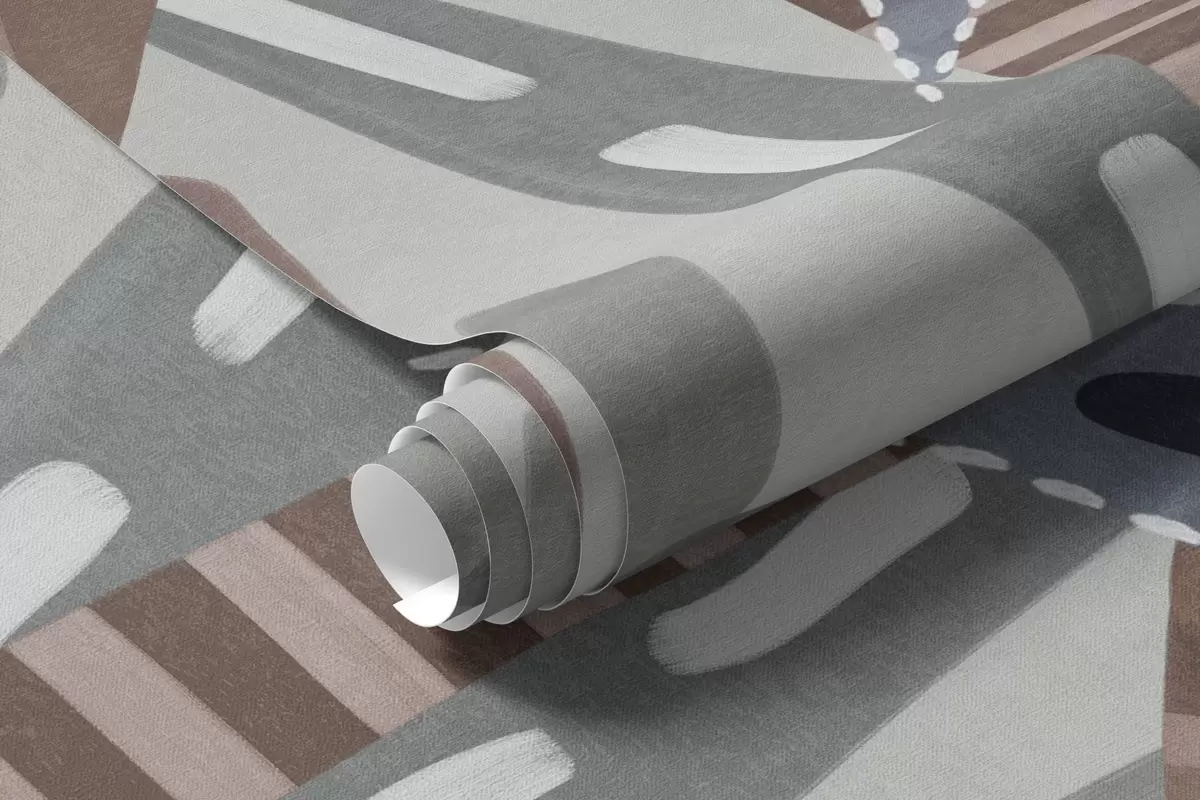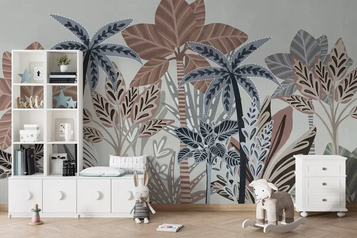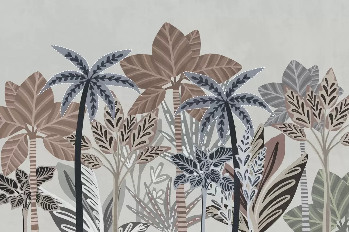 Murais de parede Plantas tropicais texturizadas e palmeiras com cores suaves em estilo boho decorativo contra um fundo cinzento Nr. w09639v1