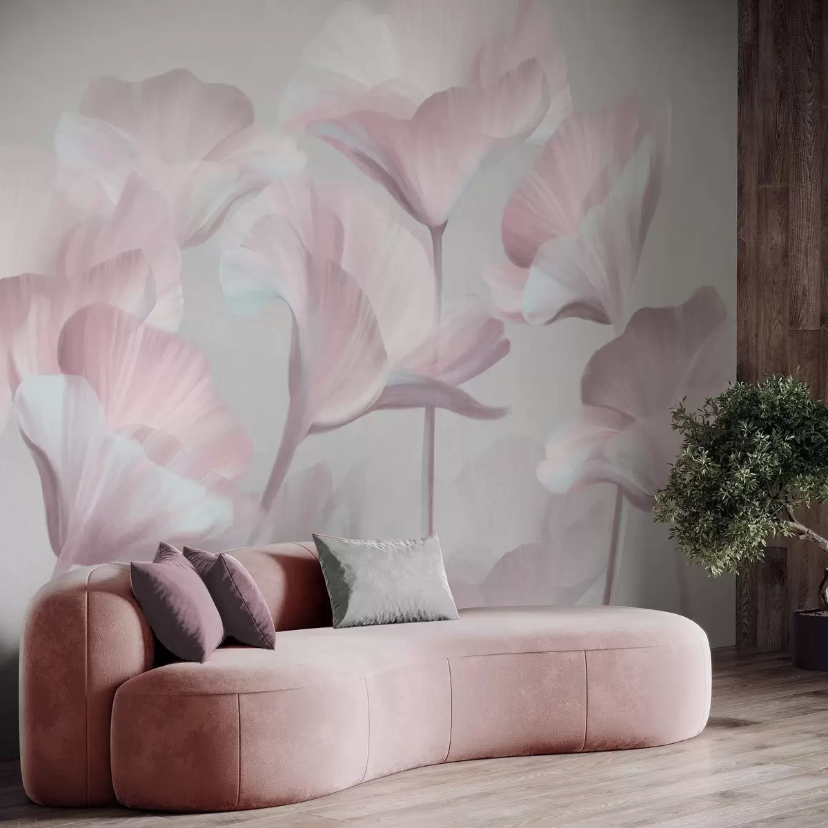 Murais de parede Flores de lótus translúcidas em rosa pálido com textura e pétalas delicadas contra um fundo cinza suave Nr. w09640v1