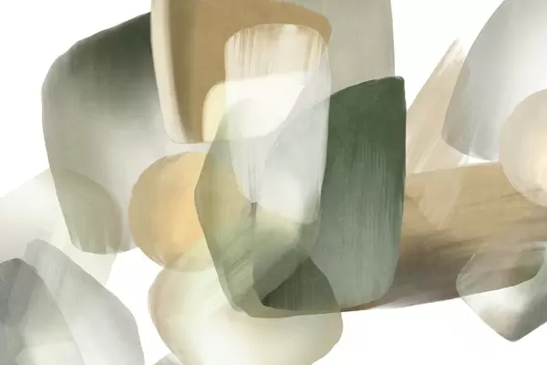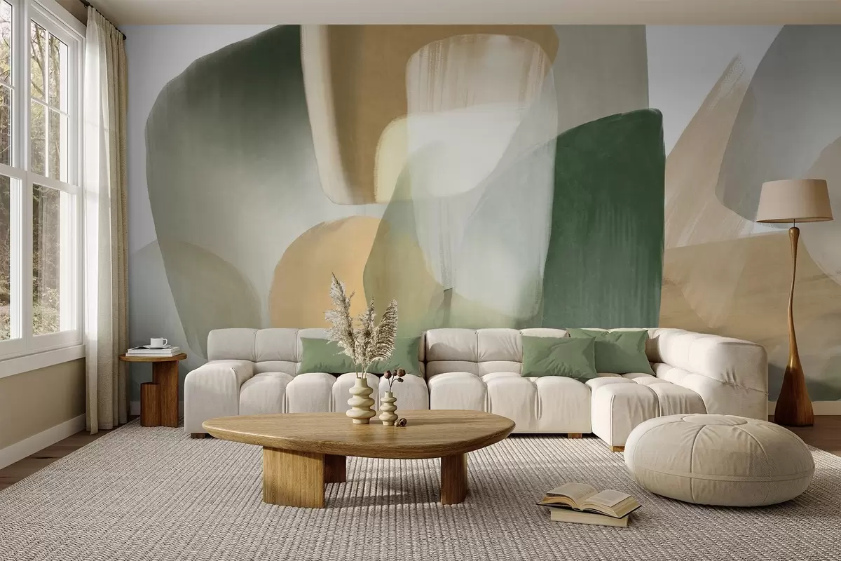 Murais de parede Formas abstratas texturizadas em tons suaves de verde e bege, com bordas suaves e camadas sobrepostas Nr. w09642