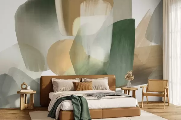 Murais de parede Formas abstratas texturizadas em tons suaves de verde e bege, com bordas suaves e camadas sobrepostas Nr. w09642