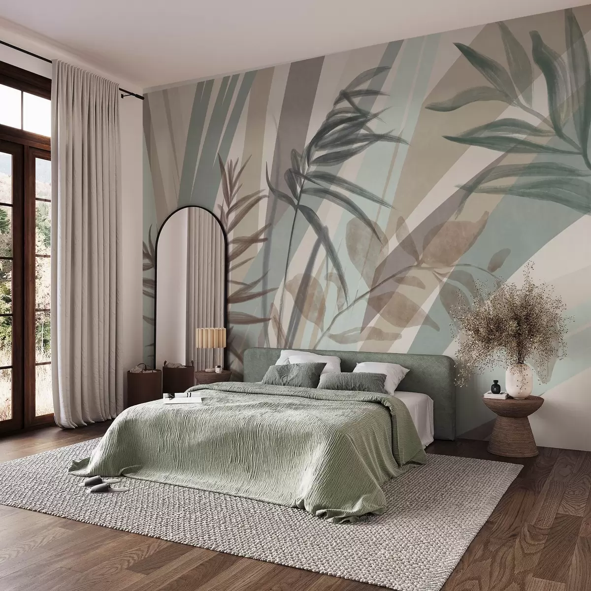 Murais de parede Relva alta com textura e folhas em tons terrosos suaves, com linhas abstratas no fundo, criando um padrão orgânico Nr. w09643