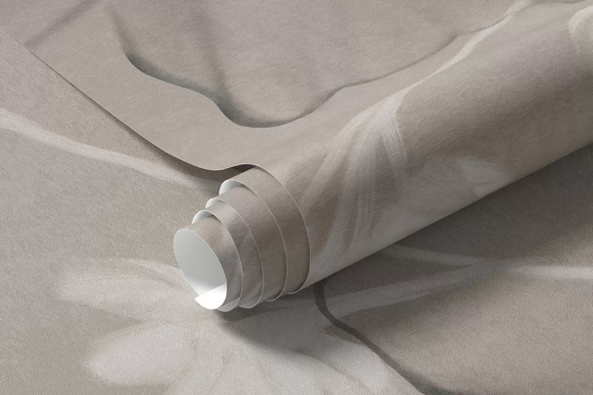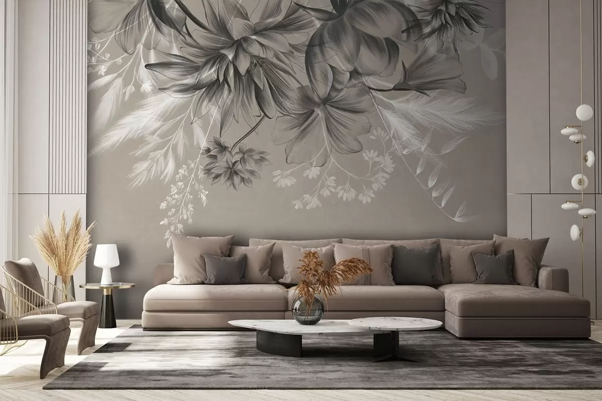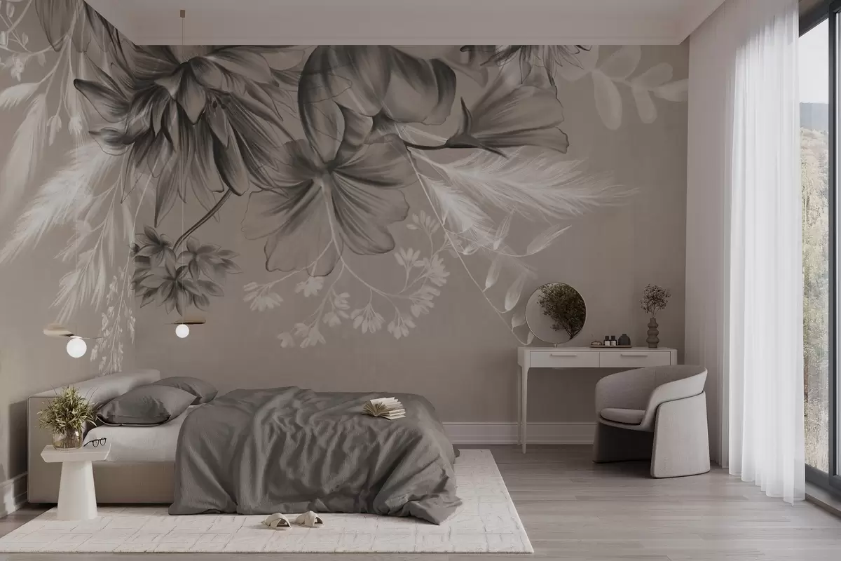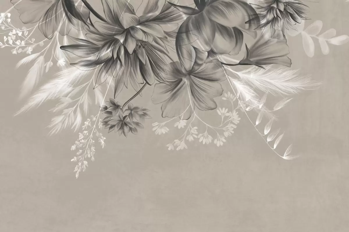 Murais de parede Flores e fetos texturizados em tons de cinza escuro e branco contra um fundo bege suave, estilo de desenho Nr. w09644