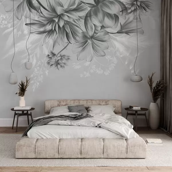 Murais de parede Flores e fetos texturizados em tons de cinza escuro e branco contra um fundo cinza suave, estilo de desenho Nr. w09644v1