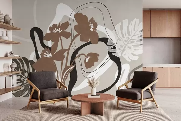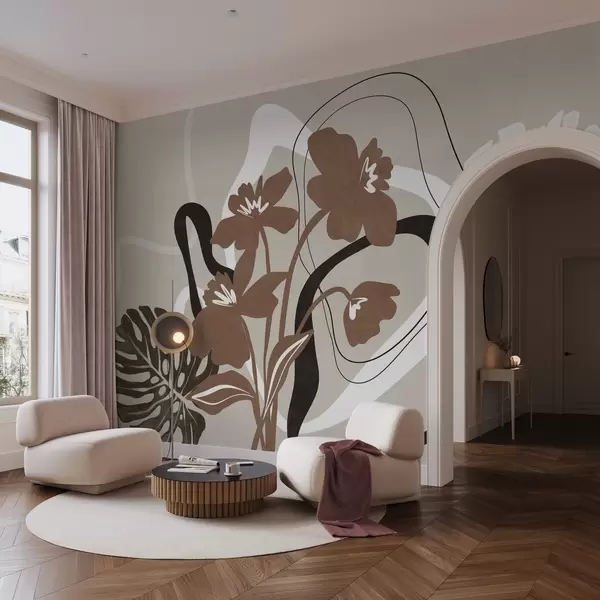 Murais de parede Flores castanhas abstratas com textura e formas brancas e pretas sobre um fundo bege, arte minimalista Nr. w09645v1