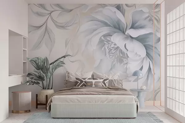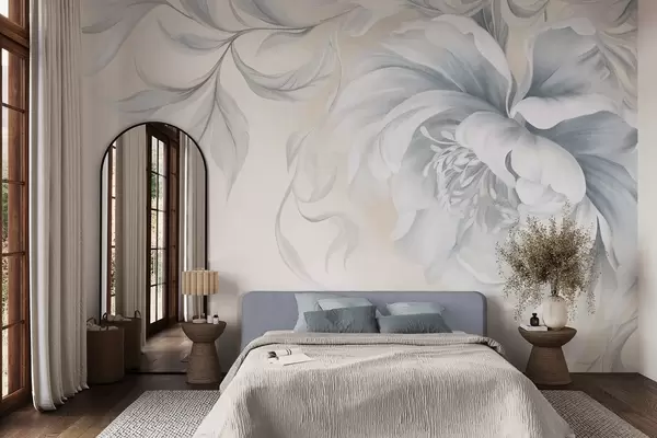 Murais de parede Peônia grande e texturada, com pétalas delicadas e folhas cinzentas, pintada num estilo suave Nr. w09647