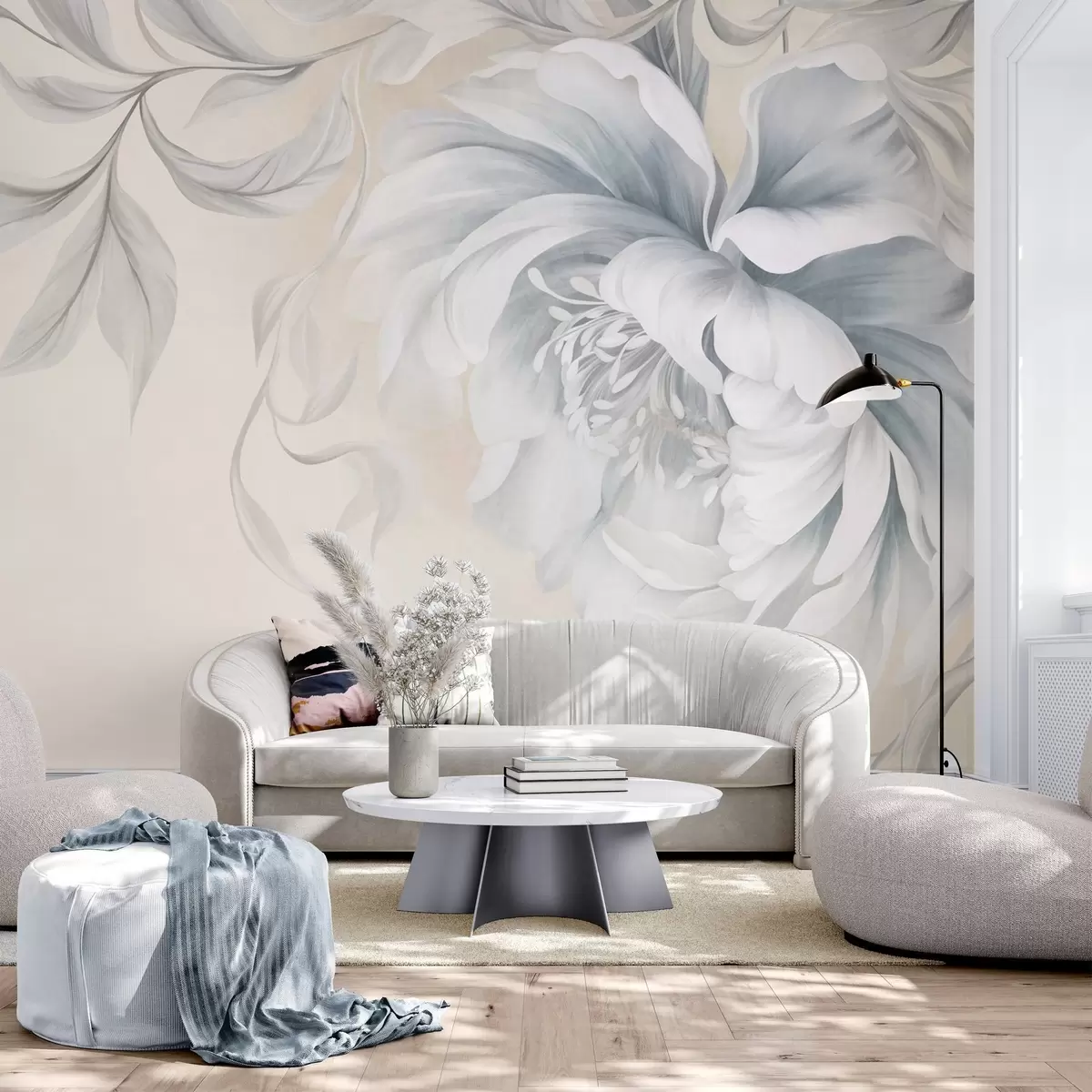 Murais de parede Peônia grande e texturada, com pétalas delicadas e folhas cinzentas, pintada num estilo suave Nr. w09647