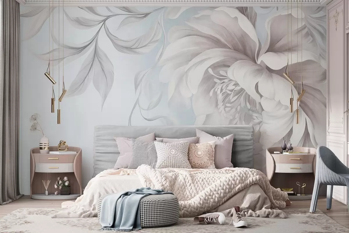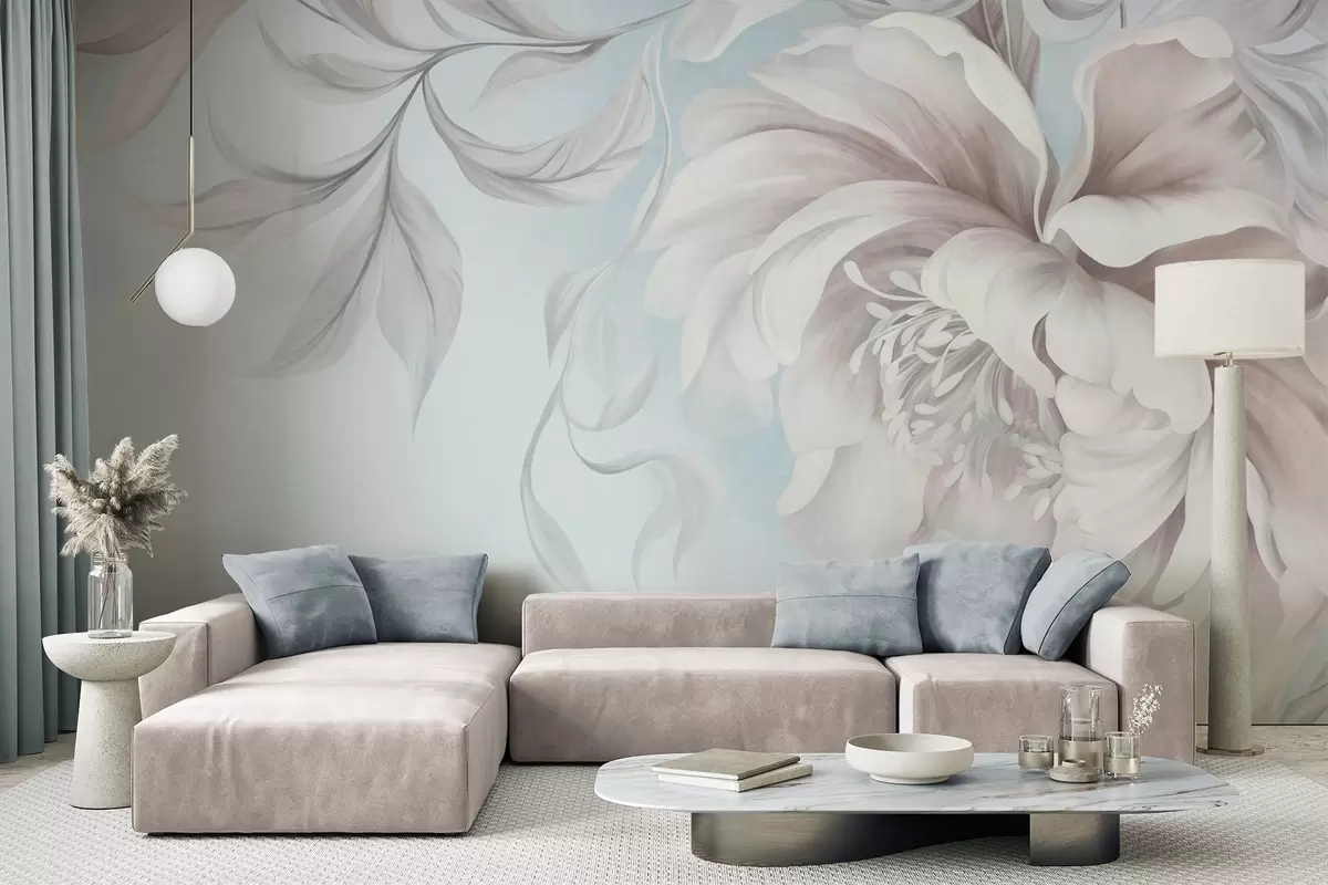 Murais de parede Peônia grande e texturada, com pétalas delicadas e folhas cinzentas, pintada num estilo suave Nr. w09647v1