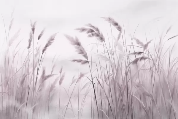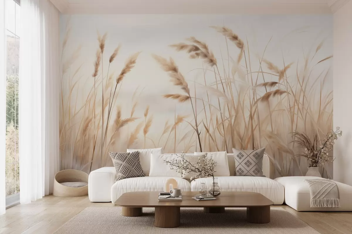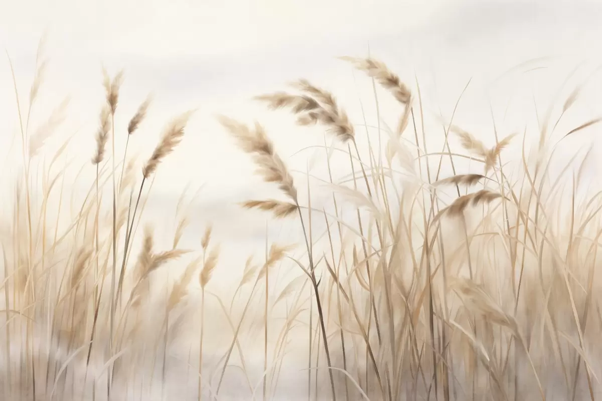 Murais de parede Erva seca alta e texturada com espigas de trigo no campo contra um fundo suave e pálido Nr. w09648