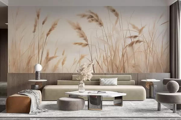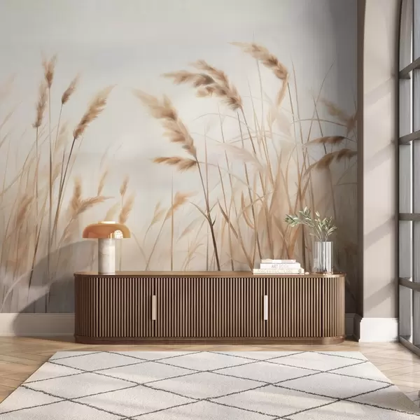 Murais de parede Erva seca alta e texturada com espigas de trigo no campo contra um fundo suave e pálido Nr. w09648