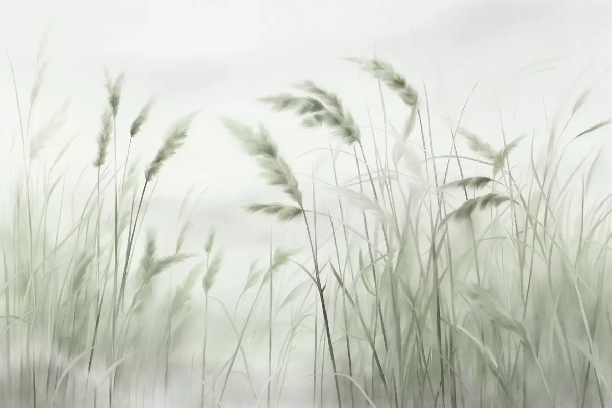Murais de parede Erva seca alta e texturada com espigas de trigo no campo contra um fundo suave e pálido Nr. w09648v1
