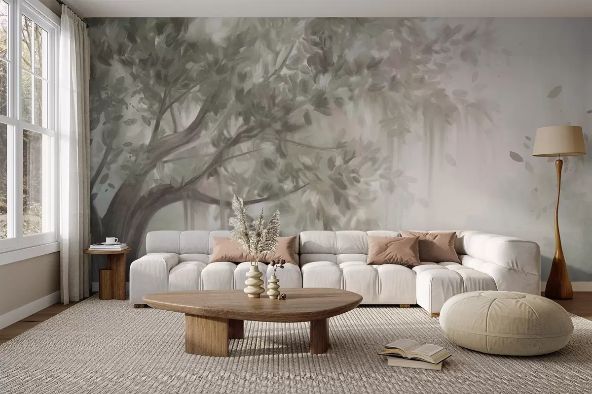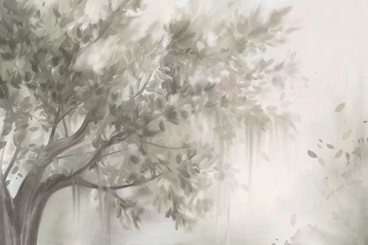 Murais de parede Árvore texturizada com folhas e ramos verdes claros, com um fundo suave e nebuloso Nr. w09650