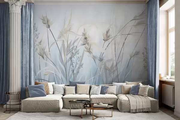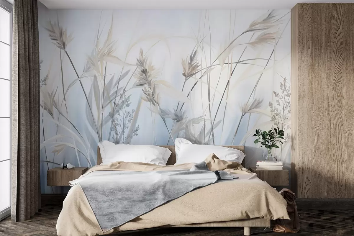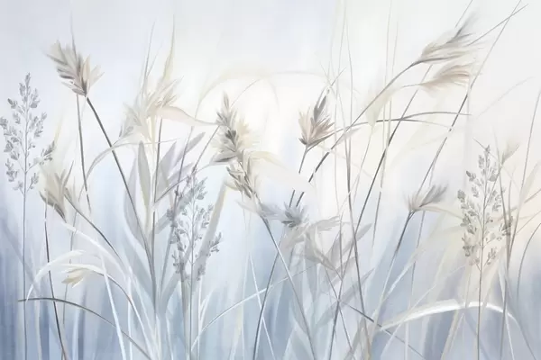 Murais de parede Talos altos e secos de erva com pontas plumosas em tons suaves, fundo azul e branco suave e nebuloso Nr. w09652