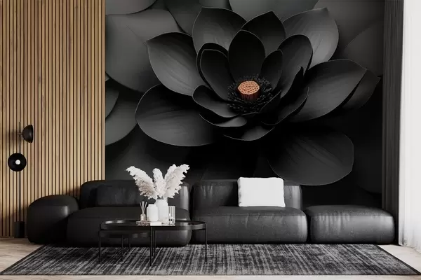 Murais de parede Flor preta minimalista com pétalas e um centro quente em contraste Nr. w09721