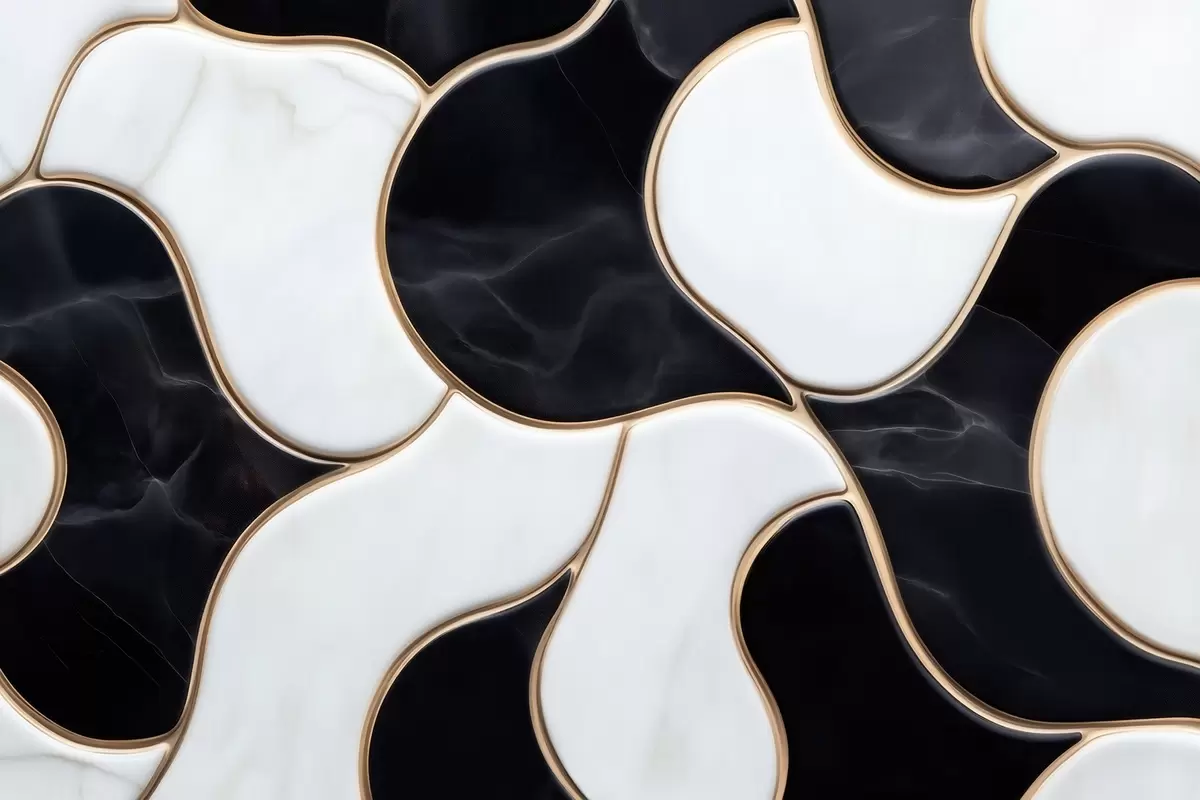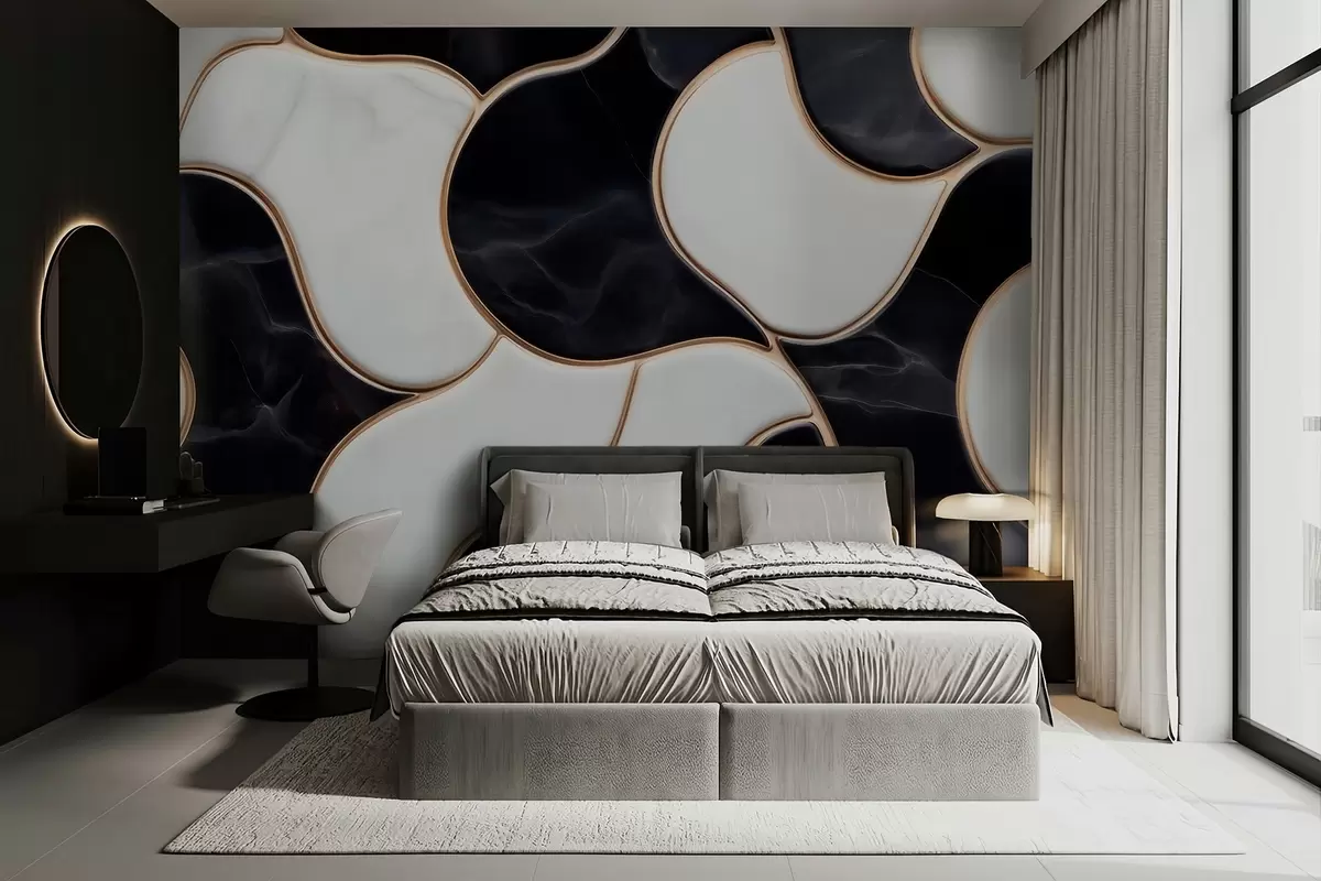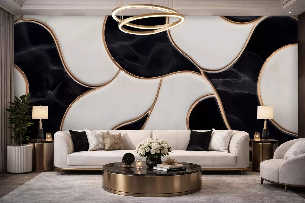 Murais de parede Imitacão abstrata de uma composição em mármore em tons de preto e branco com linhas amarelas Nr. w09733