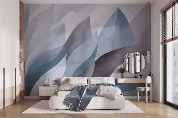 Murais de parede Folhas abstratas, tons terrosos suaves de azul com detalhes delicados em linha, textura suave de aguarela Nr. w09736v1