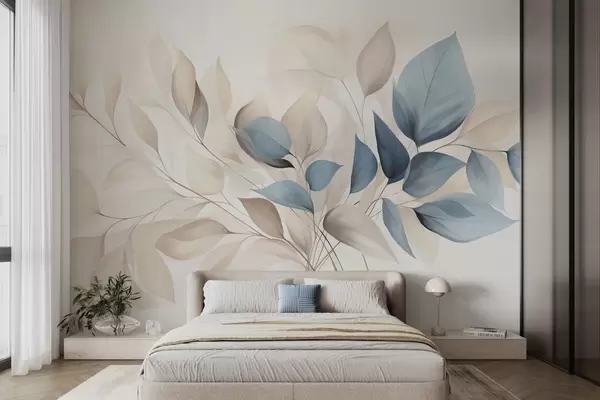 Murais de parede Folhas abstratas translúcidas em tons de azul, bege e creme, arte texturizada Nr. w09744