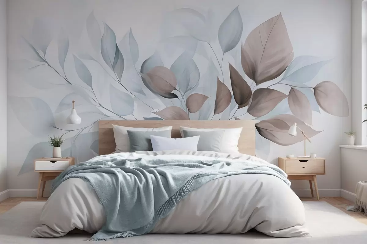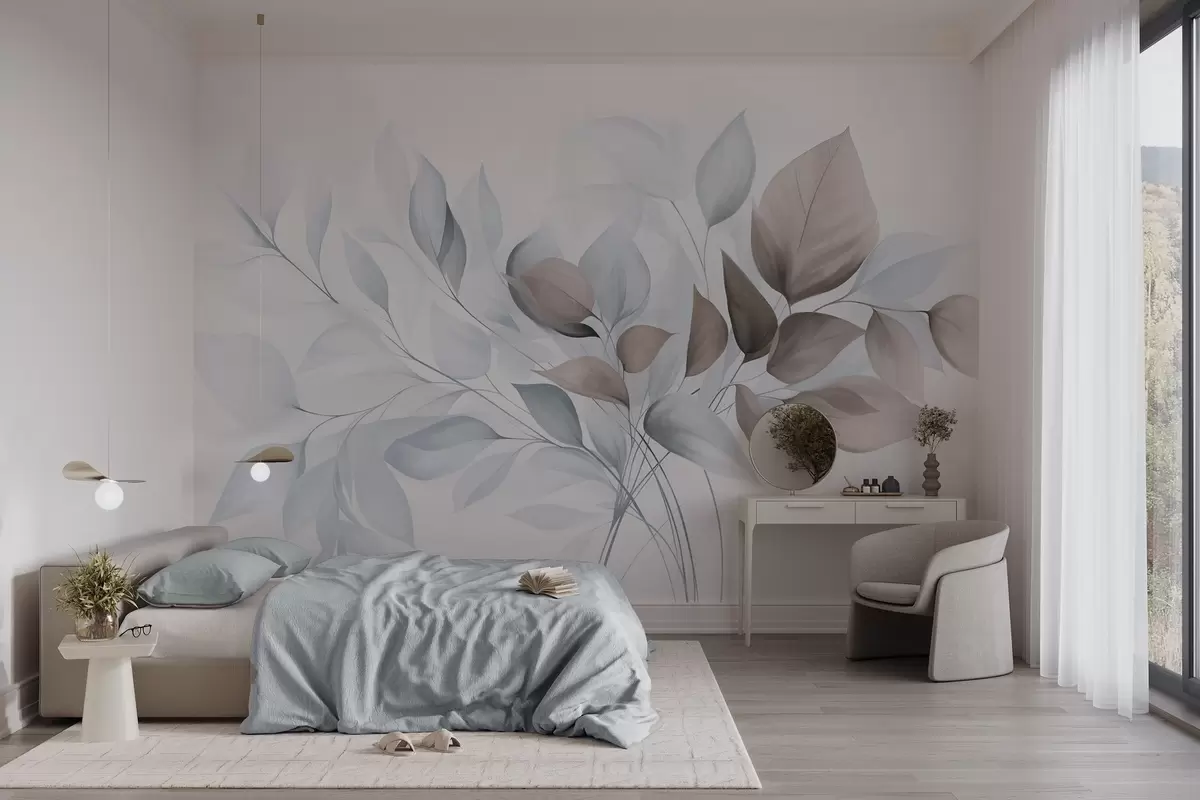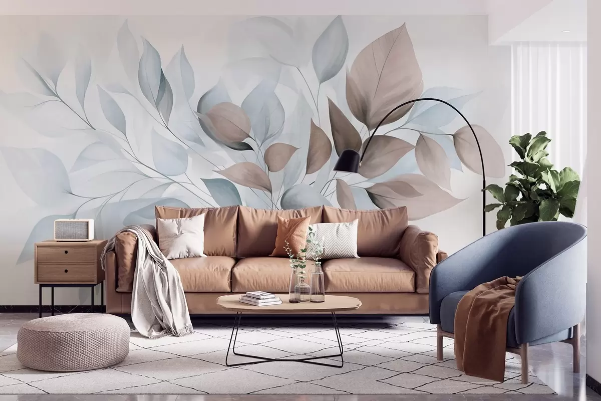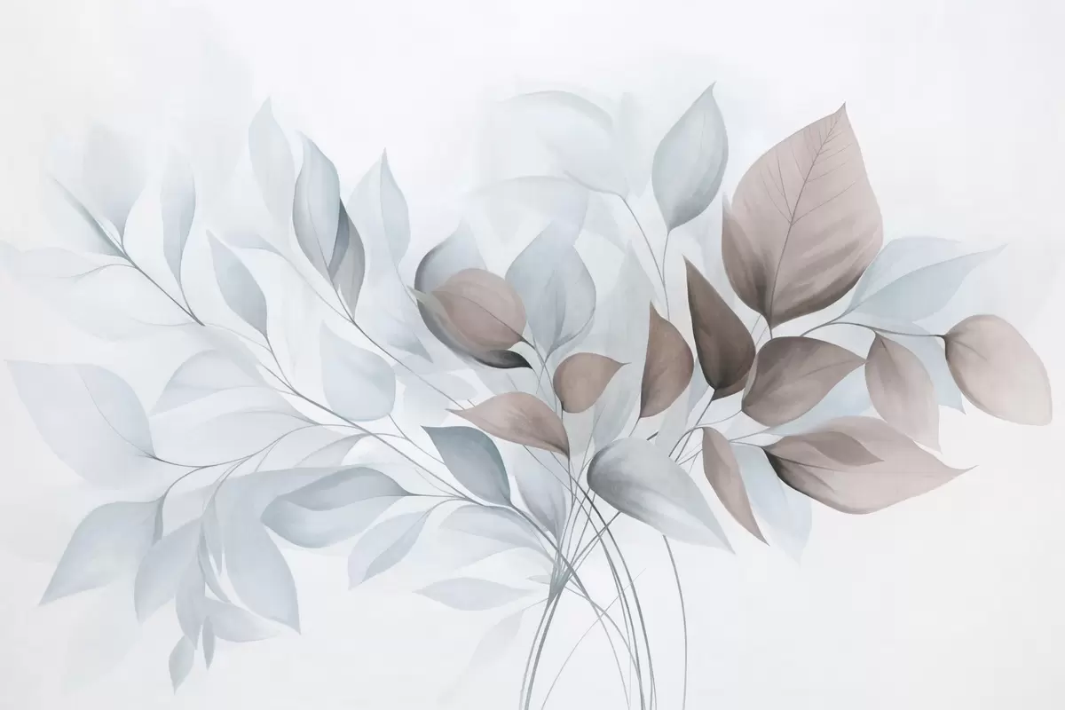Murais de parede Folhas abstratas translúcidas em tons de azul, bege e castanho, arte texturizada Nr. w09744v1