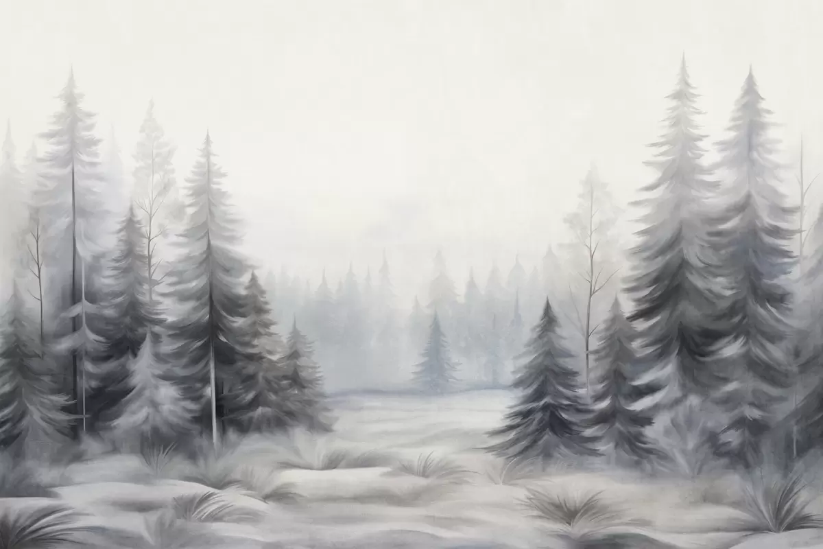 Murais de parede Árvores texturizadas de uma floresta de inverno envolta em neblina, em tons suaves de cinza e branco Nr. w09745