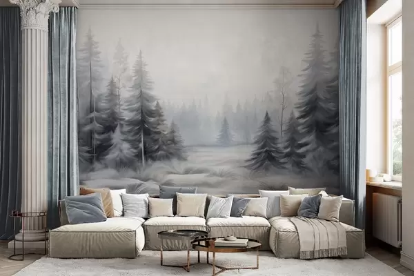 Murais de parede Árvores texturizadas de uma floresta de inverno envolta em neblina, em tons suaves de cinza e branco Nr. w09745