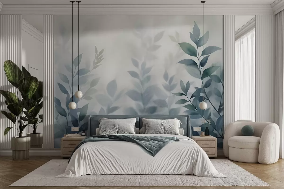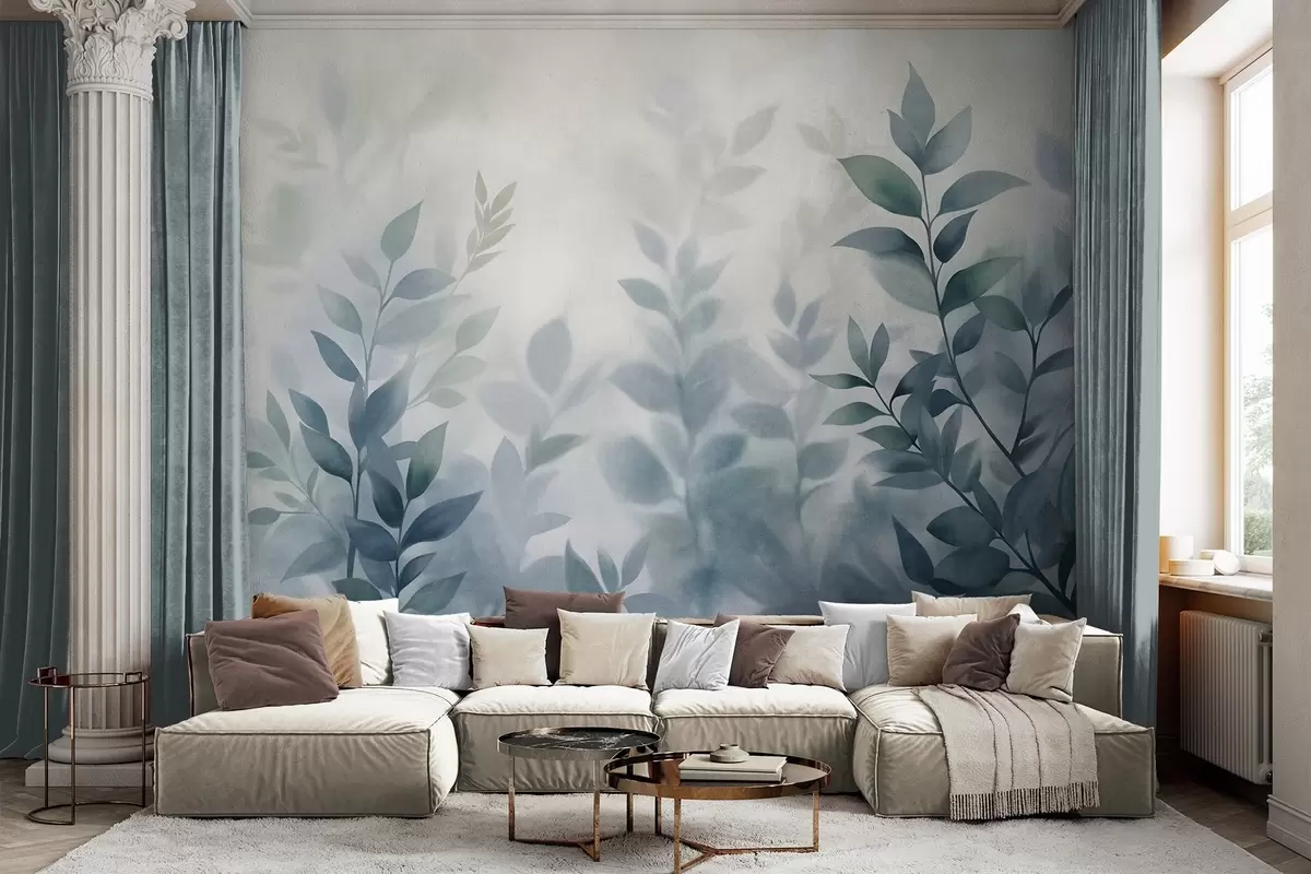 Murais de parede Galhos delicados com folhas azuis suaves, estilo pintura em aquarela, arte texturizada Nr. w09750v1