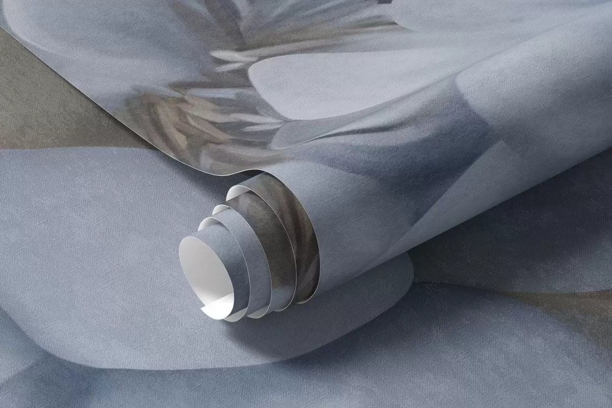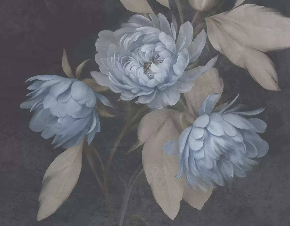 Murais de parede Flores de peônia azul-claro com textura e folhas bege sobre um fundo escuro Nr. w09751
