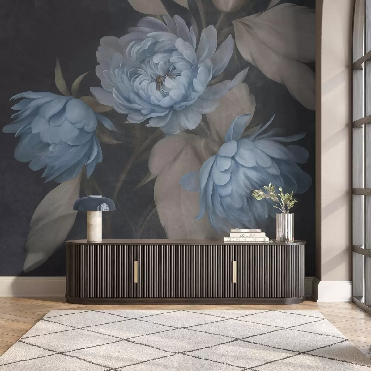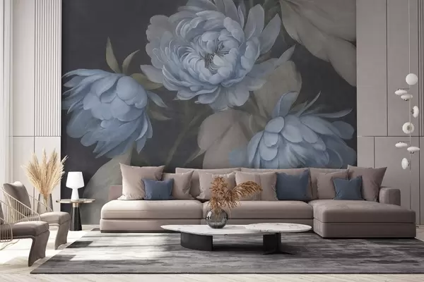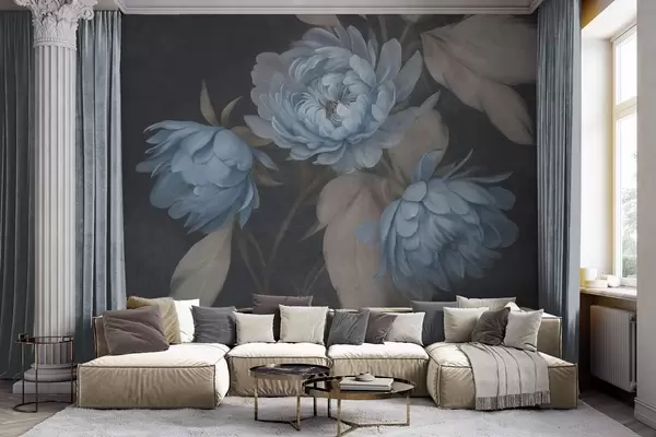 Murais de parede Flores de peônia azul-claro com textura e folhas bege sobre um fundo escuro Nr. w09751