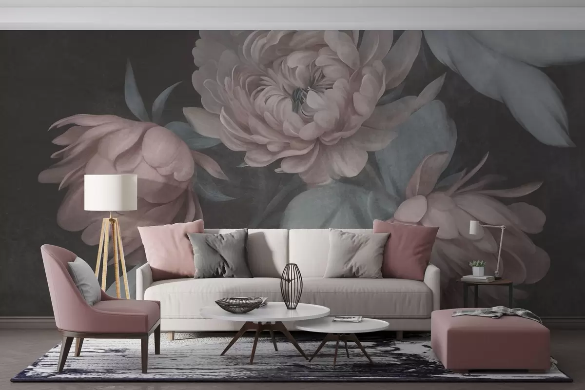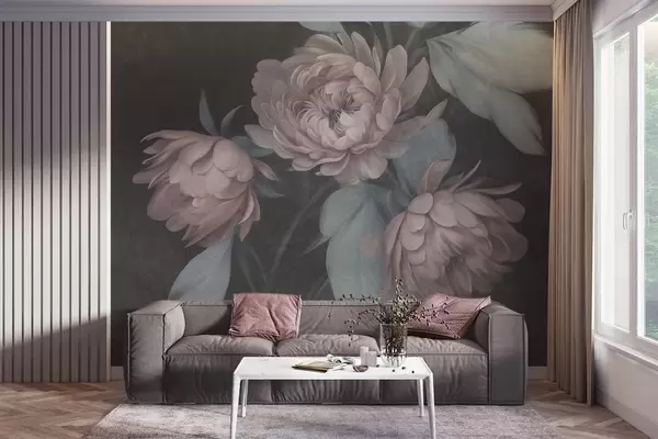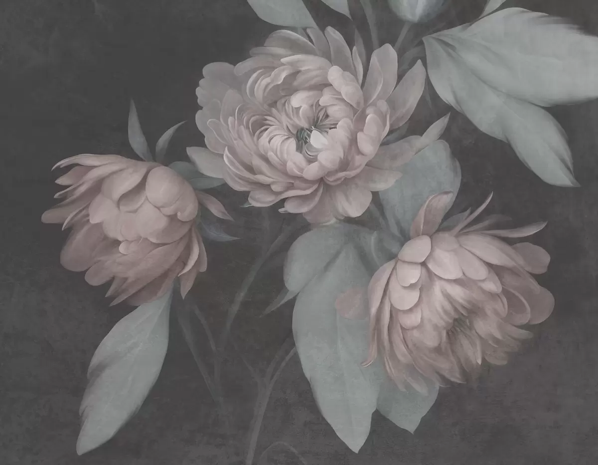 Murais de parede Flores de peônia rosa claro com textura e folhas verdes suaves sobre um fundo escuro Nr. w09751v1